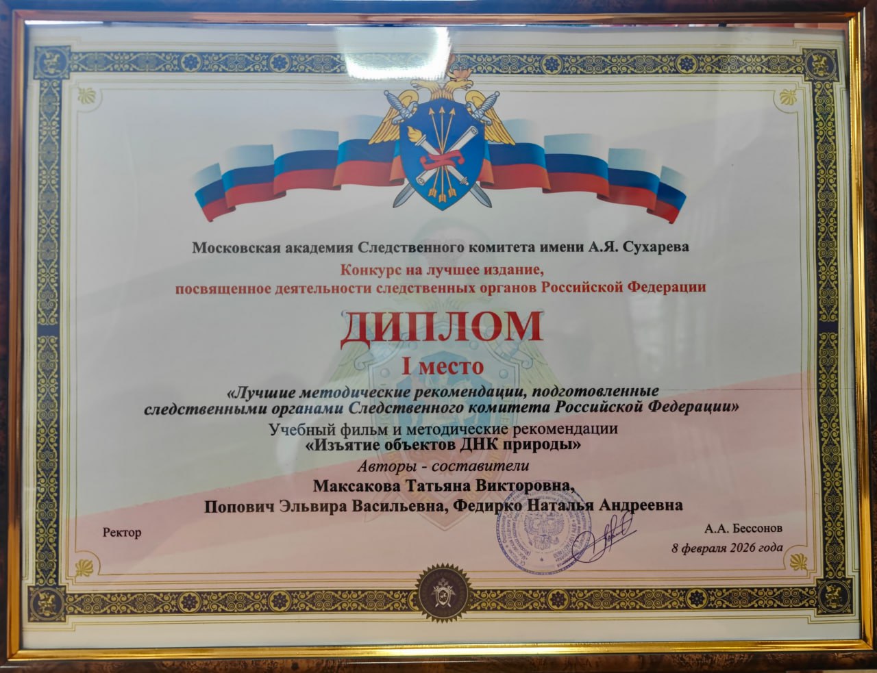 Старший следователь криминалист Максакова Татьяна Викторовна, следователь следственного отдела по Ивановскому району Попович Эльвира Васильевна и инспектор по взаимодействию с общественностью по электронным каналам связи Федирко Наталья Андреевна одержали победу, заняв первое место во всероссийском конкурсе, проводимом Московской академией Следственного комитета Российской Федерации имени А.Я. Сухарева. В номинации «Лучшие методические рекомендации, подготовленные следственными органами СК России» сотрудницы сняли и представили учебный фильм и методические рекомендации «Изъятие объектов ДНК природы», наглядно демонстрирующий следователям особенности безошибочного проведения следственных действий по изъятию и исследованию объектов, которые в дальнейшем используются для проведения генетических судебных экспертиз. Учебный фильм содержит в себе практические методики разрешения сложных и нестандартных следственных ситуаций, доказавшие свою эффективность в следственной и судебной практике.