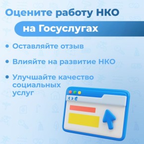 Теперь на портале «Госуслуг» доступна функция «Оценки качества оказания социально ориентированной некоммерческой организацией общественно полезных услуг».Что это такое?Это возможность оставить отзыв о качестве услуг, которые предоставляют НКО, и...