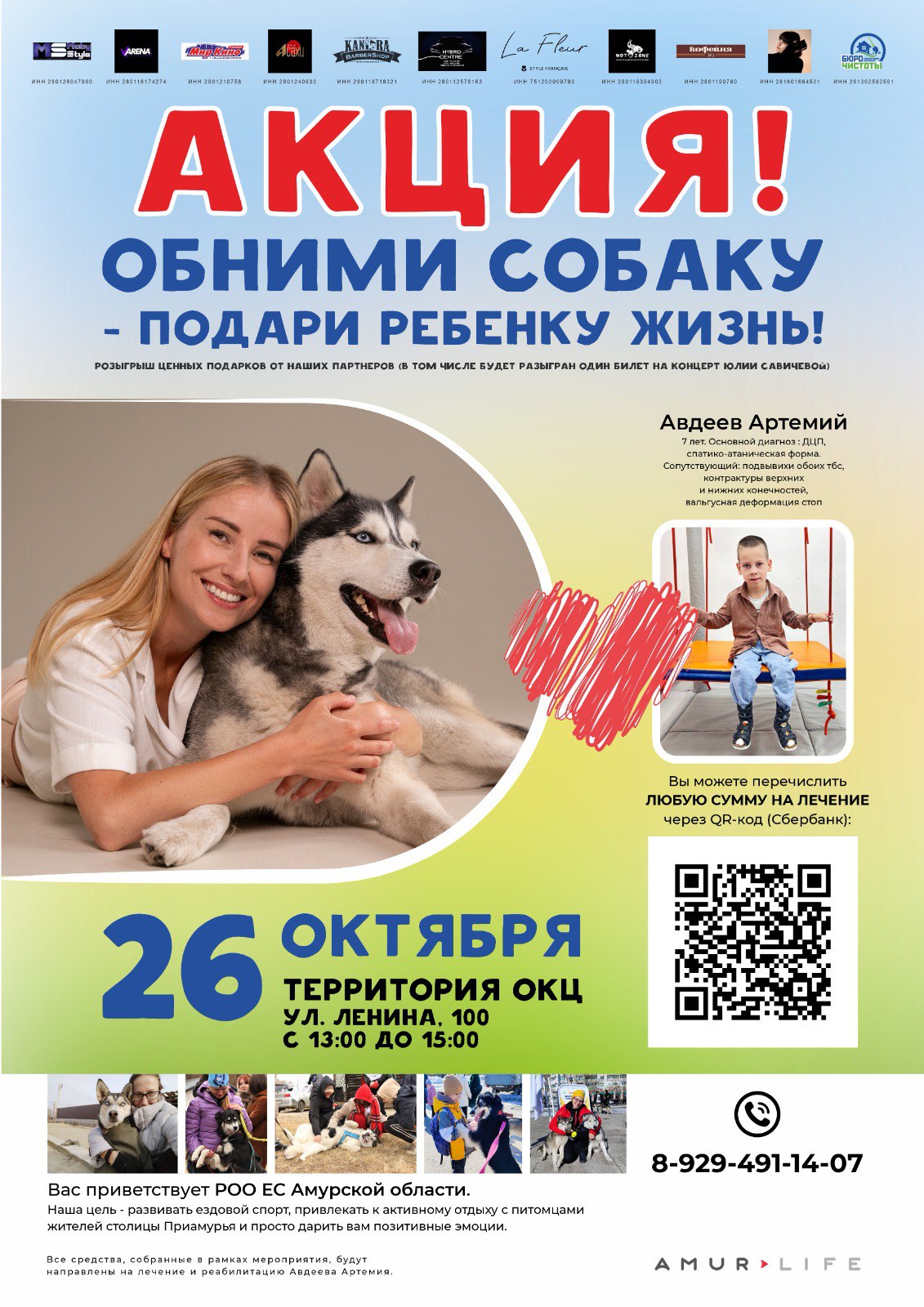 Помочь мальчику можно, приехав 26 октября с 13:00 до 15:00 на площадь около ОКЦ (Ленина, 100). Амурчане смогут пообниматься с собаками, поучаствовать в розыгрыше призов и других активностях. А самое главное, помочь Артемию стать ближе к мечте.