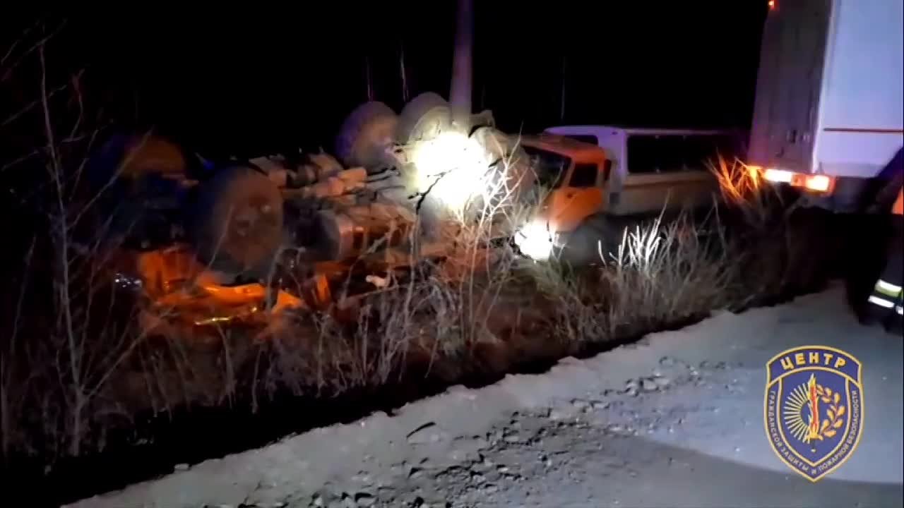 КамАЗ, принадлежащий промышленному предприятию, опрокинулся во время буксировки другой техники. В момент аварии в кабине был водитель, который от полученных травм погиб на месте.