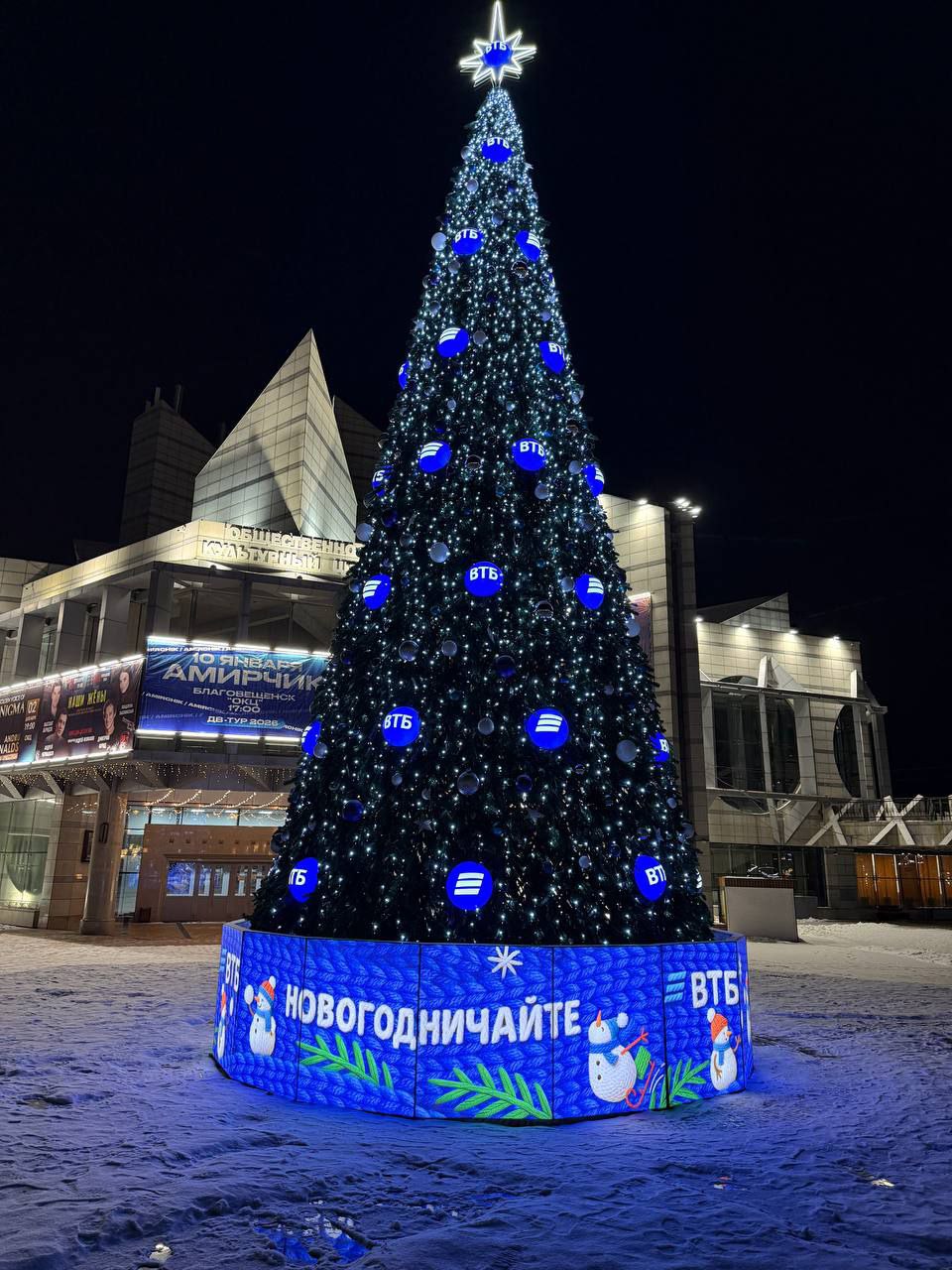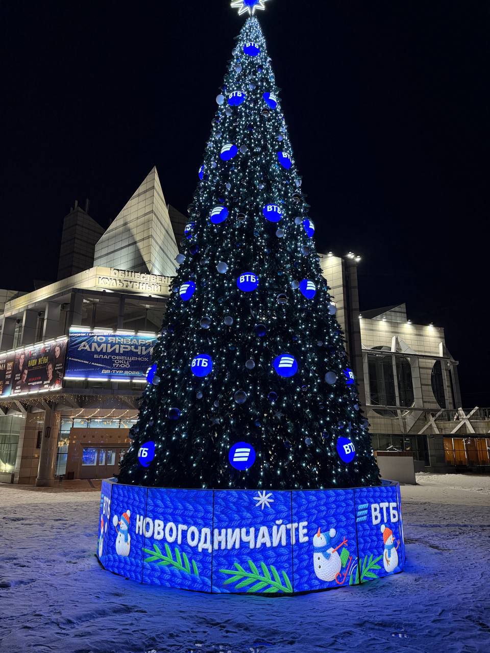 12-метровая новогодняя красавица радует амурчан на площади Общественного культурного центра. Ее украшают 540 шаров и 300 метров гирлянд, а подиум «укутан» синим вязаным шарфом с уютным посланием «Новогодничайте».