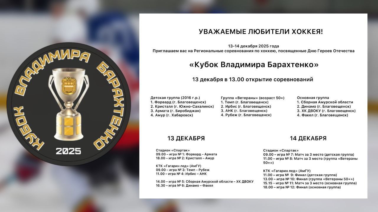 Соревнования стартуют в субботу, 13 декабря. Бороться за кубок имени Героя России будут команды из Благовещенска, Южно-Сахалинска, Биробиджана и Хабаровска. Завершится мероприятие 14 декабря.