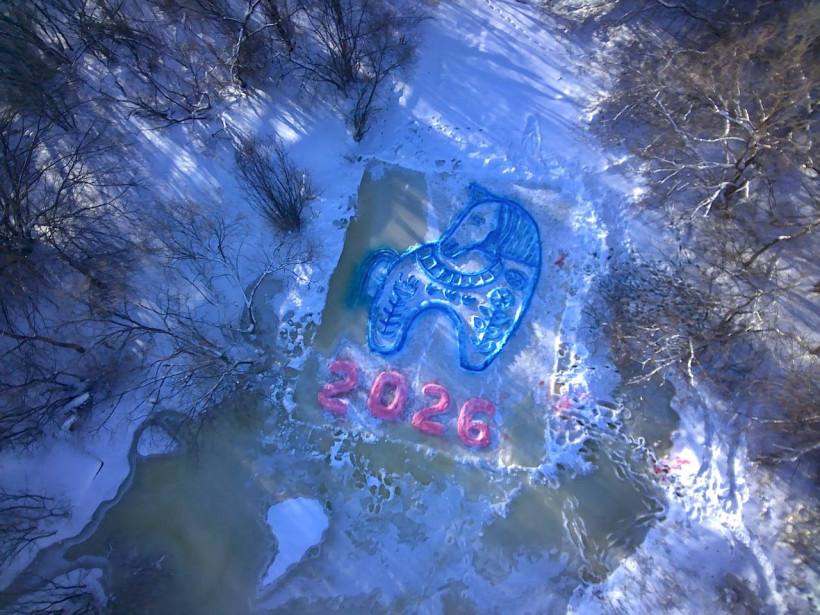 В селе Михайловка на льду поселилась лошадка, расписанная под гжель