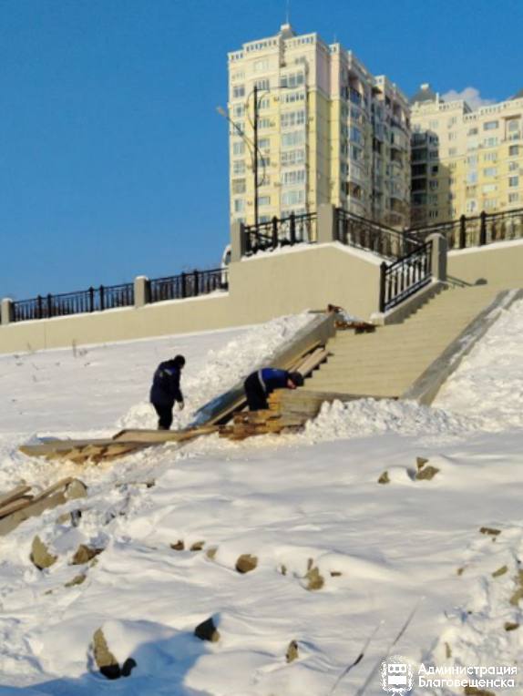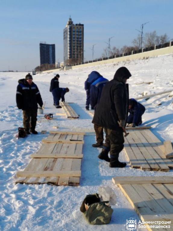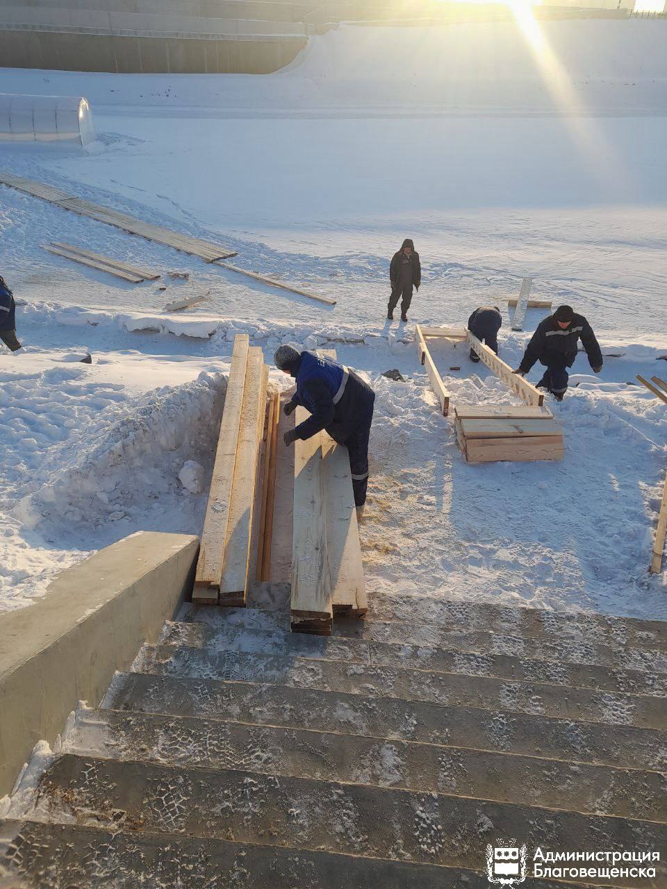 В Благовещенске продолжают готовить купель на пляже «Пограничный» к массовому посещению. Для безопасного спуска и подхода к проруби здесь соорудили деревянные конструкции.