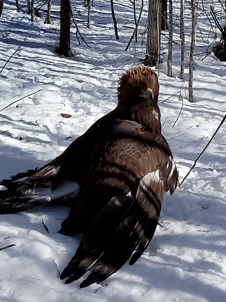 Чтобы не допустить переохлаждения и защитить хищника от возможных опасностей, его временно разместили в теплом пустом вагончике и сообщили о находке в Росприроднадзор. По фото- и видеоматериалам специалисты Службы установили, что перед ними молодая особь беркута — редкого вида, занесенного в Красную книгу России.