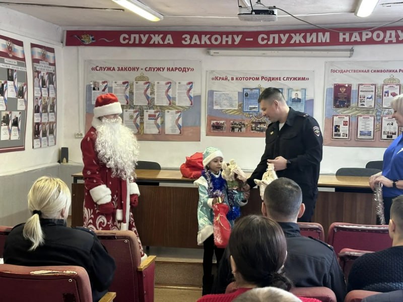 Поздравить стражей порядка с наступающим праздником пришли школьники в образах главных зимних волшебников – Деда Мороза и Снегурочки. Их волшебный мешок был полон не только сладостей, но и особенных открыток с теплыми пожеланиями, которые ребята изготовили своими руками.