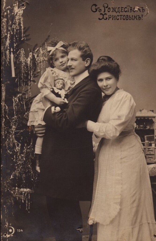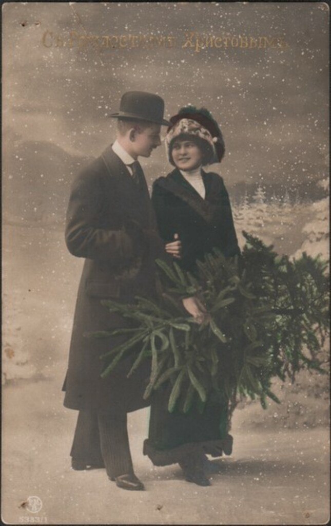 Впервые рождественские открытки появились в Англии в 1794 году. А в Россию первые такие открытки привозили купцы из-за границы в 90-х годах XIX века. Поздравительный текст при этом был на английском или немецком языках, что считалось особым шиком: https://asn24.ru/news/culture/143049/