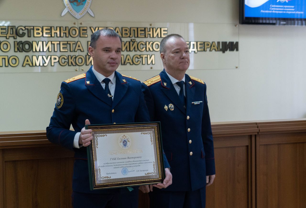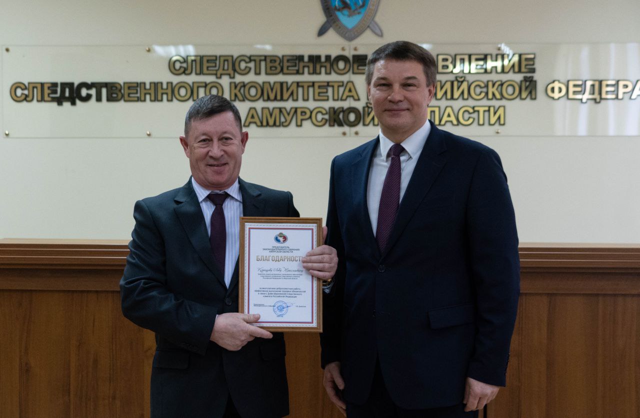 Константин Викторович отметил Благодарностями председателя Законодательного Собрания Амурской области работу следователя по особо важным делам следственного отдела по Магдагачинскому району следственного управления СК РФ по Амурской области старшего лейтенанта юстиции Юлию Бабенкину и водителя отдела материально-технического обеспечения следственного управления СК РФ по Амурской области Льва Корендова.