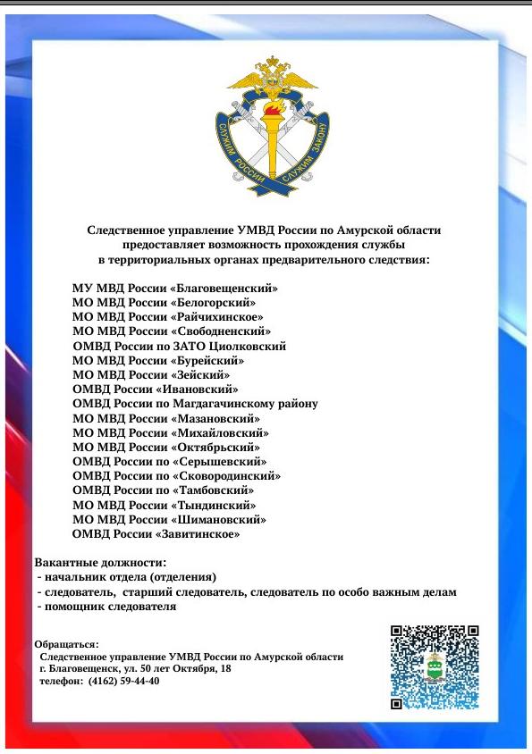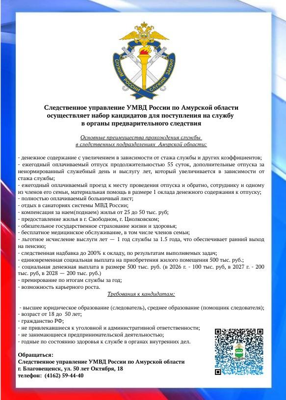 Следственное управление УМВД России по Амурской области объявляет набор кандидатов для поступления на службу в органы предварительного следствия.