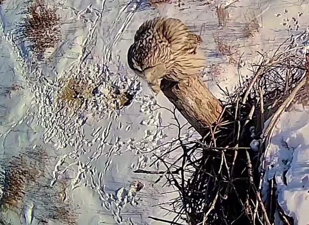 Неизвестно, сколько времени пернатый хищник выжидал, сидя на треноге, но пикировал он всего за три секунды. Птица буквально упала на свое крыло, вероятно, чтобы грызун не сбежал. Через непродолжительное время подняв мышь клювом, длиннохвостая неясыть взлетела и вновь села на треногу. Еще какое-то время она посидела с добычей, будто хвастаясь, и приступила к трапезе.