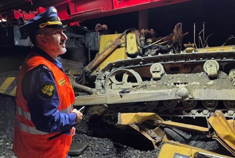 На перегоне Дальневосточной железной дороги (Беленькая — Путевой пост 139 км) во время «технологического окна» рабочие меняли рельсошпальную решетку. Хозяйственный поезд съехал на участок с демонтированными рельсами — укладочный кран и три...
