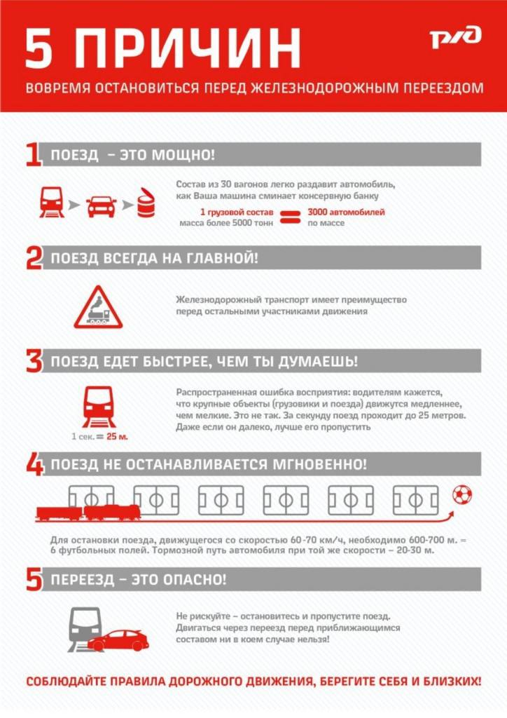 Железная дорога — зона повышенной опасности. Ежегодно здесь происходят несчастные случаи, которые можно было бы предотвратить. Помните, что переходить пути можно только в специально оборудованных местах — по пешеходным мостам, тоннелям и настилам. Никогда не пытайтесь сократить путь через рельсы в неположенном месте!
