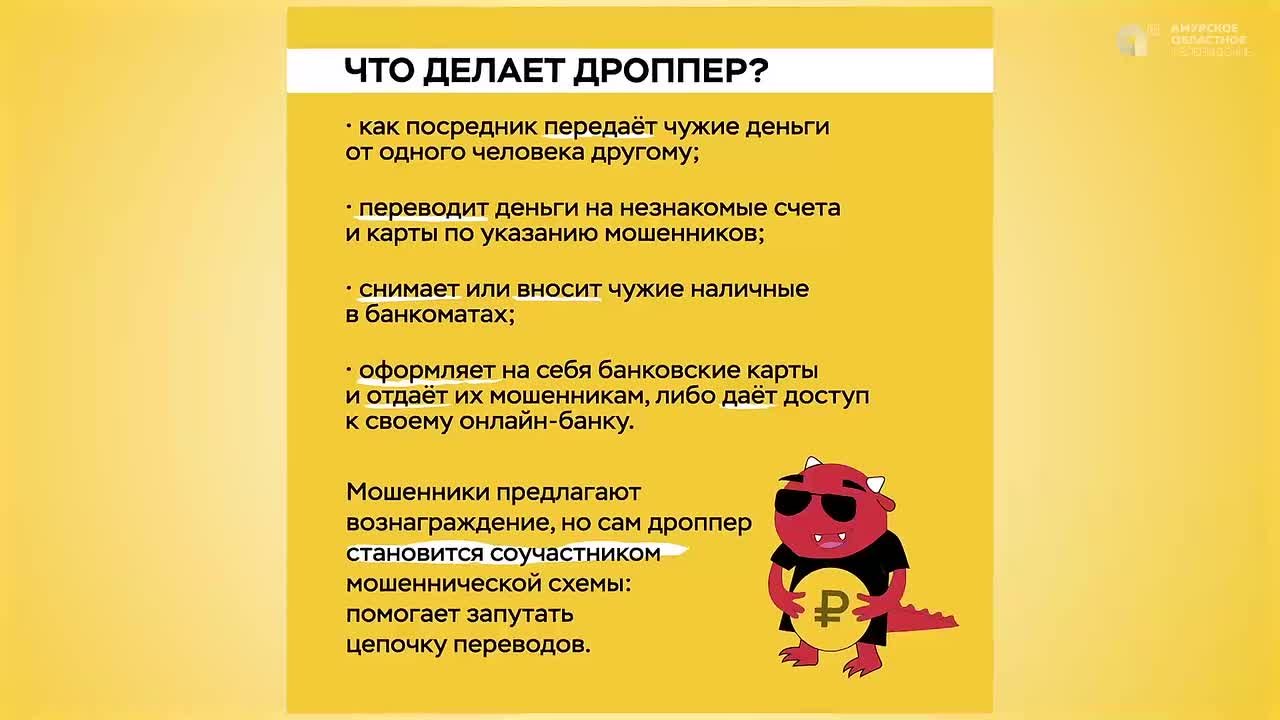 В нашем сюжете мы вместе со специалистом отделения Банка России по Амурской области рассказываем как не стать таким посредником и не лишиться собственных средств.