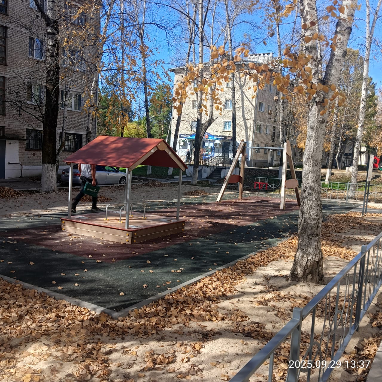 После обновления во дворе появился современный игровой комплекс с качелями, песочницей, горкой. Также на территории установили стол со скамейками, диваны, навесы от солнца, урны и ограждение.