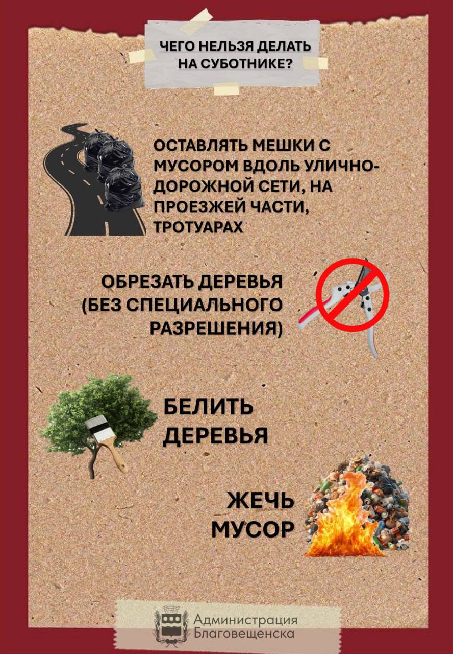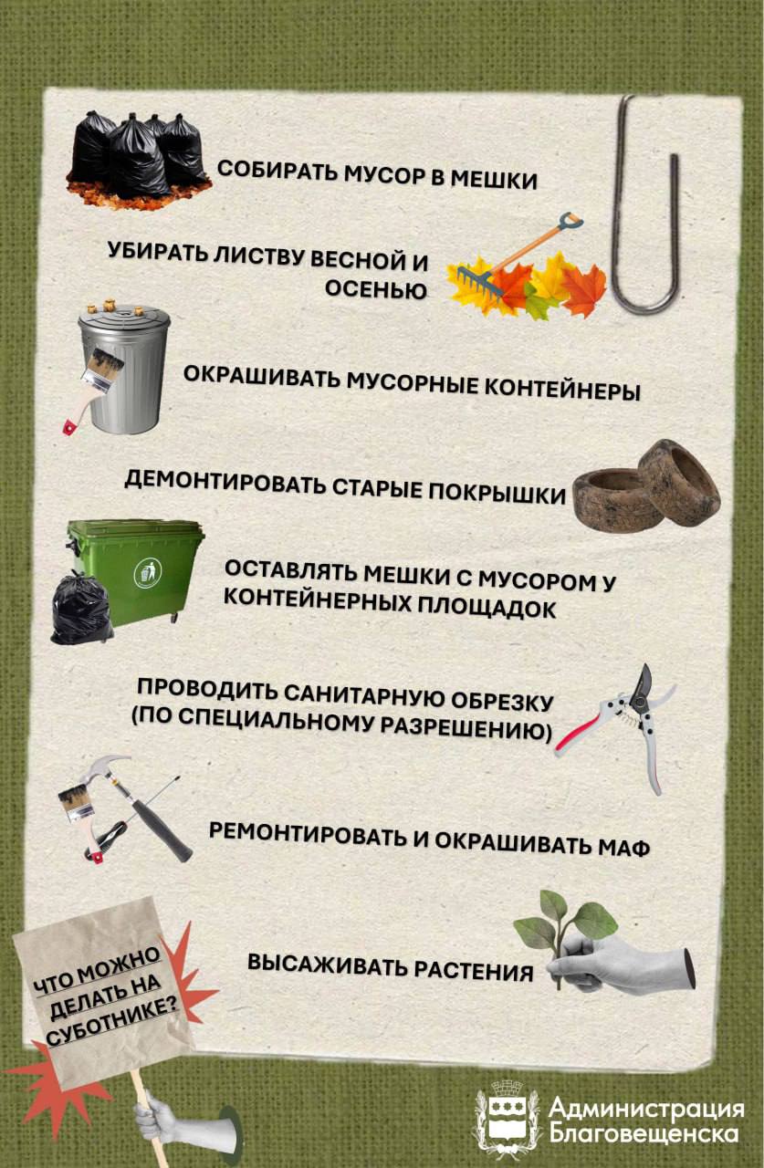 В Благовещенске проходит самая «чистая» акция «Город берегу». Присоединяются к ней сотни жителей! Убирают общественные и придомовые территории. Напоминаем горожанам как правильно вести себя на субботнике: мусор не сжигаем, мусор у обочины не оставляем. Подробнее в карточках.