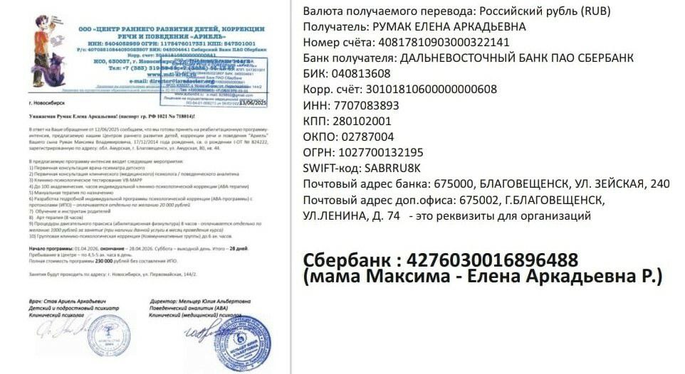 Желающие оказать помощь, могут переводить средства маме Максима. Номер карты Сбер: 4276 0300 1689 6488 (Елена Аркадьевна Р).