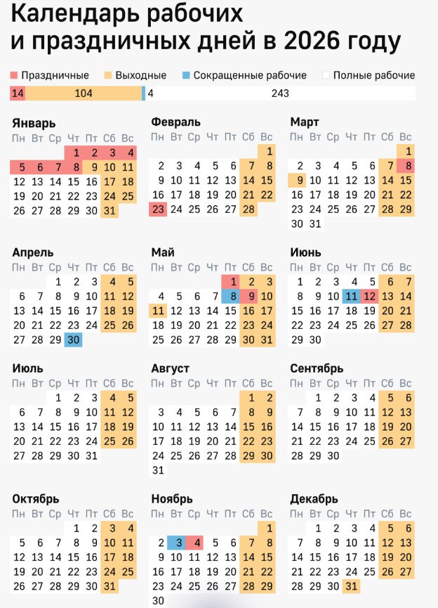 Россиян в 2026 году ожидает 118 выходных и праздничных дней и 247 рабочих дней. Это следует из норм Трудового кодекса РФ и производственного календаря, утвержденного правительством РФ.