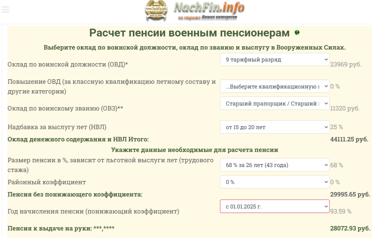 - Исходную сумму пенсии: Например, на дату увольнения военный пенсионер может получить сумму в 25 000 рублей.