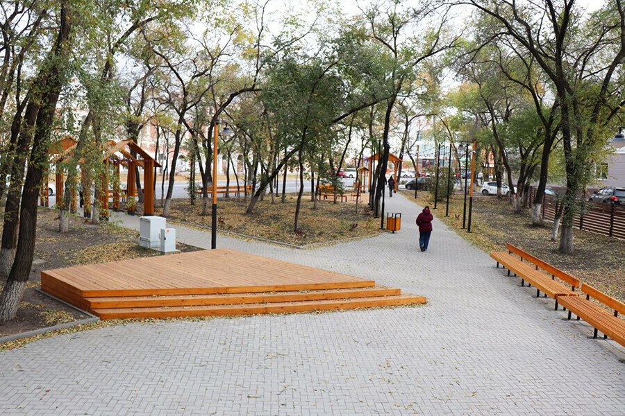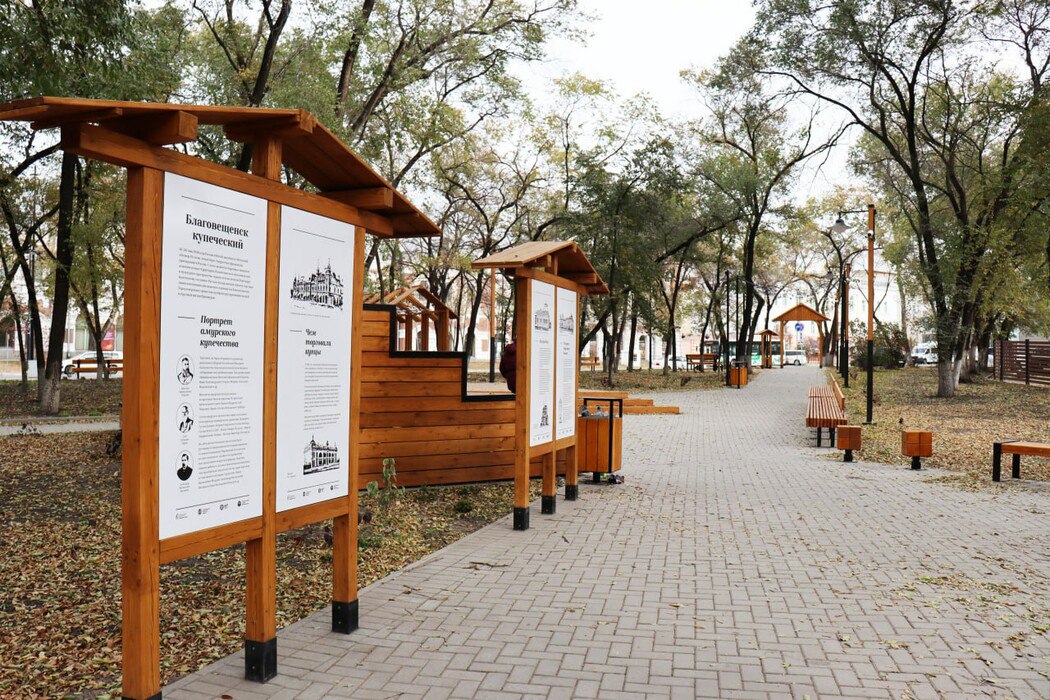 В рамках проекта специалисты уложили тротуарную плитку и установили малые архитектурные формы. В обновленном общественном пространстве появились скамейки, качели, а также информационные стенды, рассказывающие об истории Амурской области — в качестве отсылки к областному краеведческому музею, расположенному через дорогу.