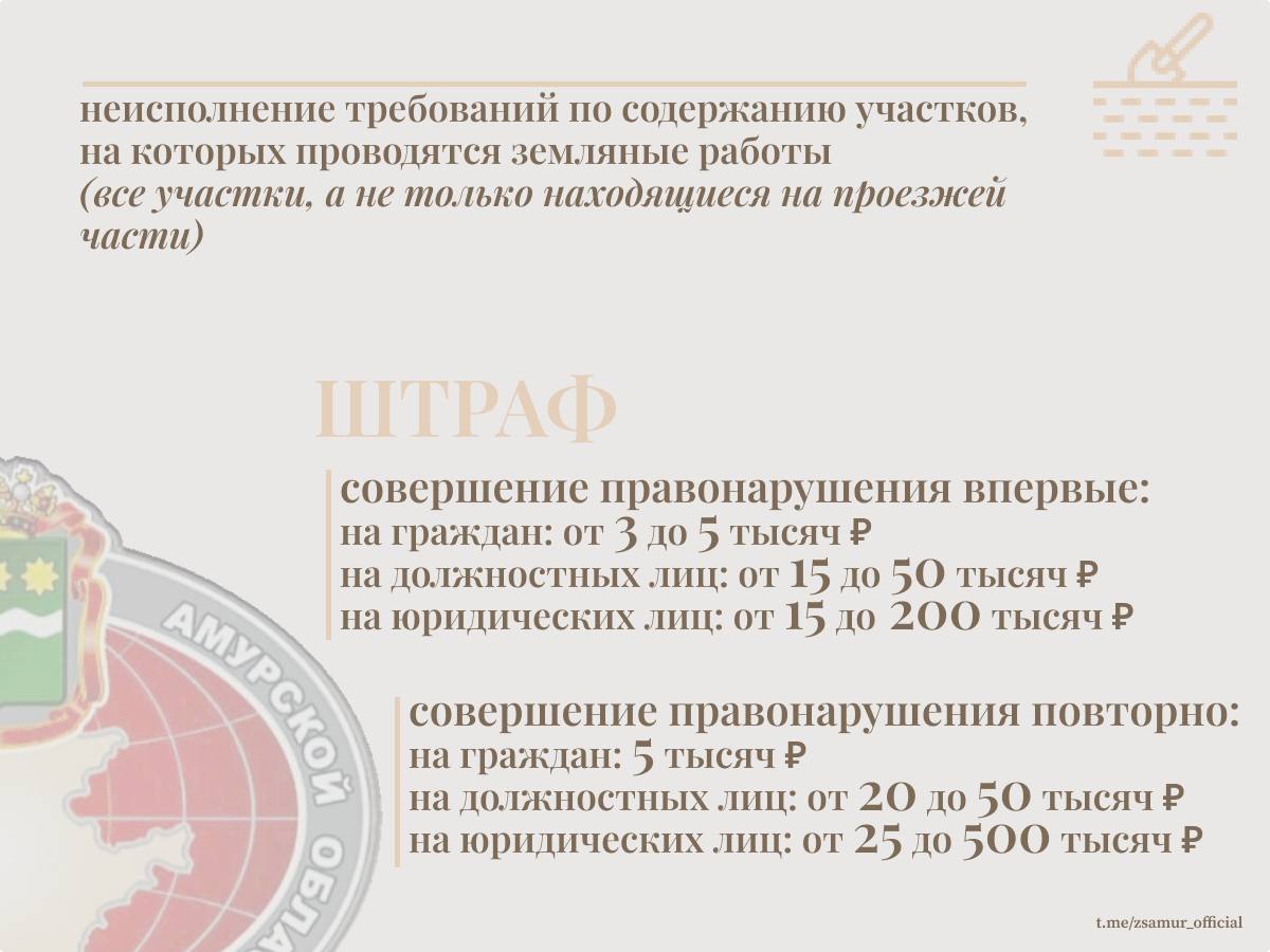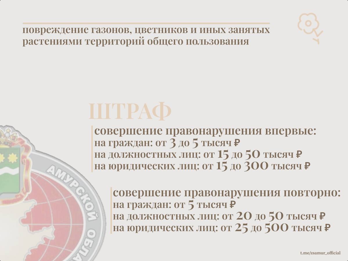 «До сих пор некоторые амурчане могли позволить себе свободно повреждать газоны и цветники, практически не опасаясь наказания.Отсутствие эффективных санкций способствовало развитию потребительского подхода к благоустройству населенных пунктов, на что регулярно жаловались главы. Между тем средства на озеленение из бюджетов муниципалитетов выделяются немалые.Также законом устанавливается административная ответственность за неисполнение требований по текущему содержанию участков, на которых производятся земляные работы. При этом к таким участкам относятся не только территория, находящая сяна проезжей части, но и прилегающая территория»,