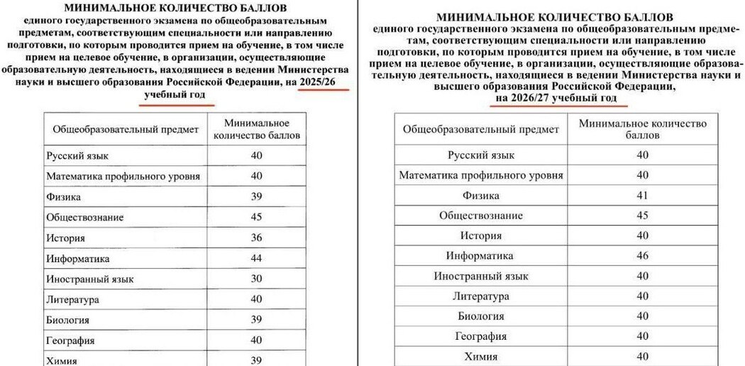 Минимальное количество баллов ЕГЭ по химии, биологии повышено с 39 до 40 баллов по сравнению с 2025/26 учебным годом, по физике – с 39 до 41 балла, по информатике – с 44 до 46 баллов, по истории – с 36 до 40 баллов, по иностранному языку сразу на 10 баллов – с 30 до 40.