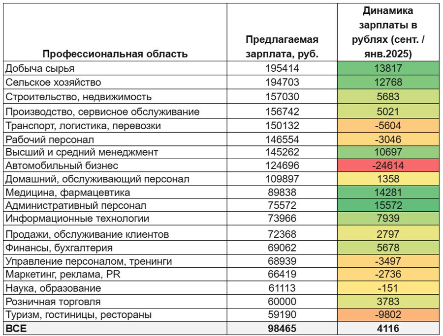 В рублях заметнее всего выросли предложения в следующих категориях: «Административный персонал» (+15 572 рубля в сентябре относительно января 2025), «Медицина, фармацевтика» (+14 281 рубль), «Добыча сырья» (+13 817 рублей), «Сельское хозяйство» (+12 768 рублей), «Высший и средний менеджмент» (+10 697 рублей).