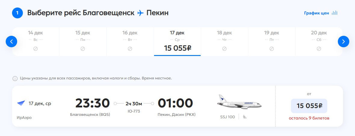 С 17 декабря авиакомпания «ИРАЭРО» начнет выполнять прямые перелеты из амурской столицы в столицу Китая. Анонс компания опубликовала в своем телеграм-канале. Пока в расписании один рейс в неделю.