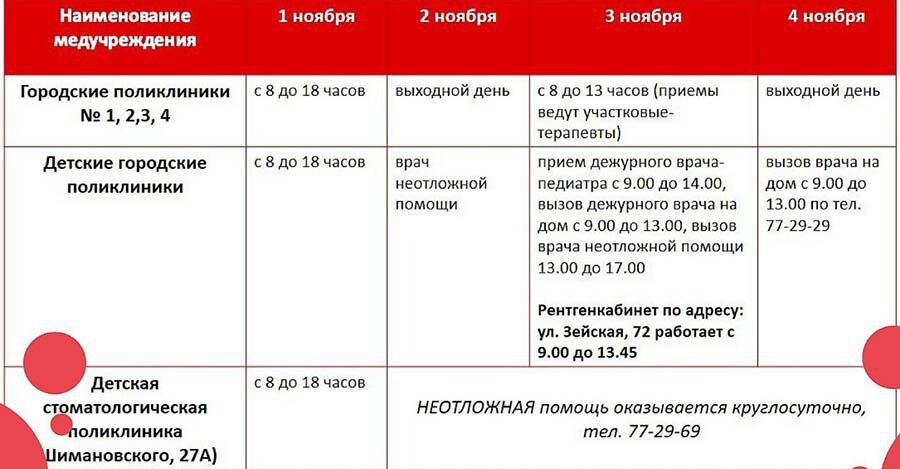 График работы поликлиник в предстоящие праздничные и выходные дни, со 2 по 4 ноября, опубликовал амурский минздрав
