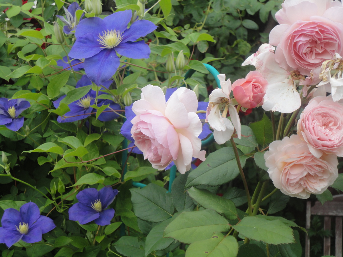 С точки зрения дизайна, клематисы, которые цветут в синих и фиолетовых оттенках, идеально гармонируют с розами разных цветов. Например, сорта с голубыми цветками создают захватывающие сочетания с розовыми и насыщенными красными оттенками.