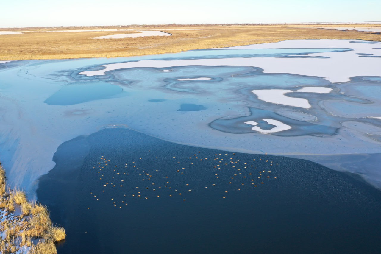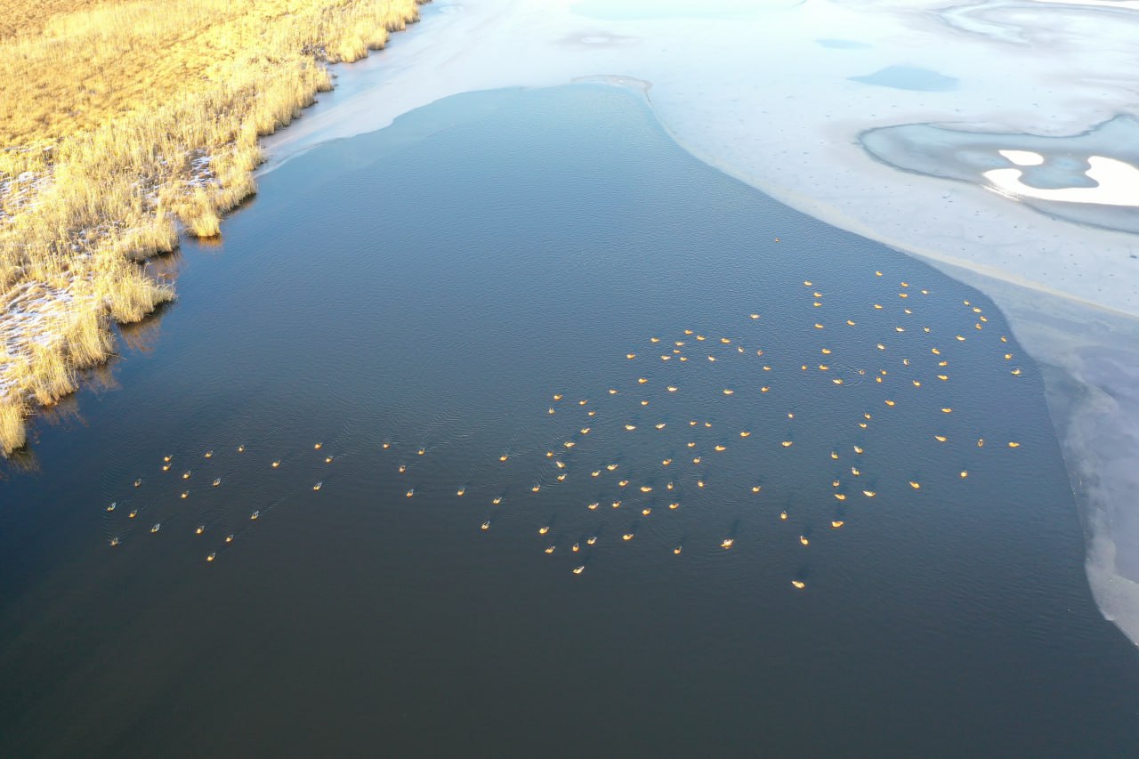 Около сотни крякв на озере Дробино в Муравьевском заказнике, словно герои сказки Мамина-Сибиряка не спешат покидать замерзающую гладь.