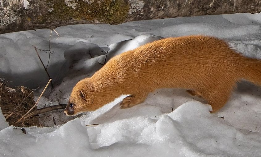 Сейчас маленький хищник исследует корни деревьев в поисках пропитания. Летний рацион в виде лягушек, птиц и рыбы теперь стал не доступен. При этом возле деревьев колонок может найти норы грызунов.