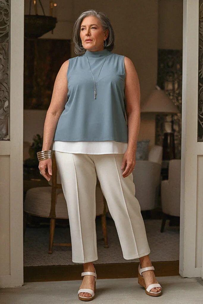 - Светлые укороченные брюки со стрелками – отличный выбор для визуального вытягивания силуэта. Они должны свободно сидеть, создавая комфортный образ. В качестве верхней части можно выбрать воздушный топ и легкую водолазку. Босоножки на танкетке добавят изящества, а минимальные украшения не отнимут внимание от общей гармонии стиля.