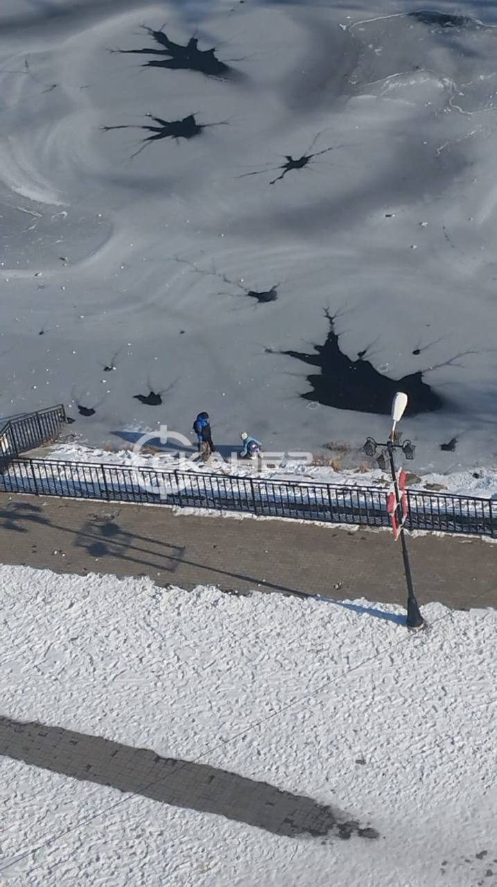 Лед еще не окреп, а детвора в Благовещенске решает провести время у водоема.