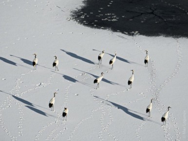 Лёд почти полностью сковал болота и журавлям стало нечем кормиться, поэтому они собираются в крупные стаи для совместного перелёта к месту зимовки в долину реки Янцзы, которая находится на юге Китая.Там у птиц будет полно еды.Весной же они вернуться...