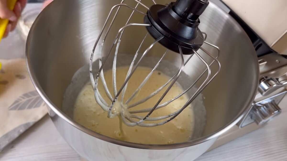 Пирог готовится удивительно быстро. Начните с взбивания яиц вместе с сахаром, добавив щепотку соли и немного ванилина. Взбивайте массу до пышной консистенции, это займет всего 3-4 минуты. Затем мягкое сливочное масло и сметану тщательно вмешайте в яичную смесь.