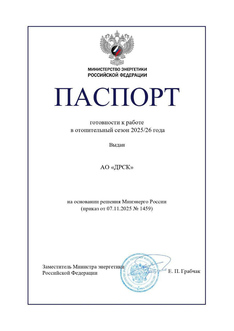 АО «Дальневосточная распределительная сетевая компания» получила Паспорт готовности к зиме 2025-2026. Энергоинфраструктура в Приморье, Хабаровском крае, Амурской области, ЕАО и Южной Якутии готова к надежной работе даже в сильные морозы.