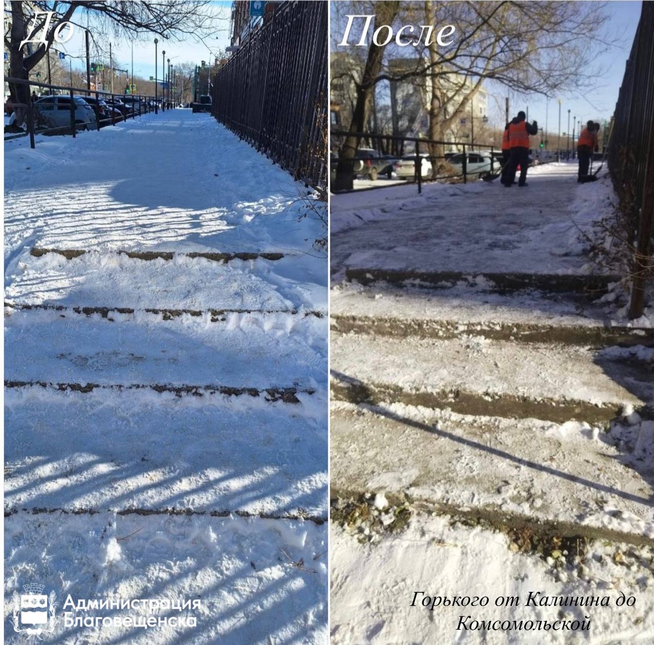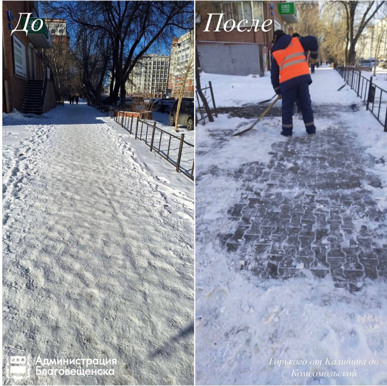 200 тонн противогололедных материалов и 45 километров очищенных дорог: ГСТК избавляет Благовещенск от последствий снегопада