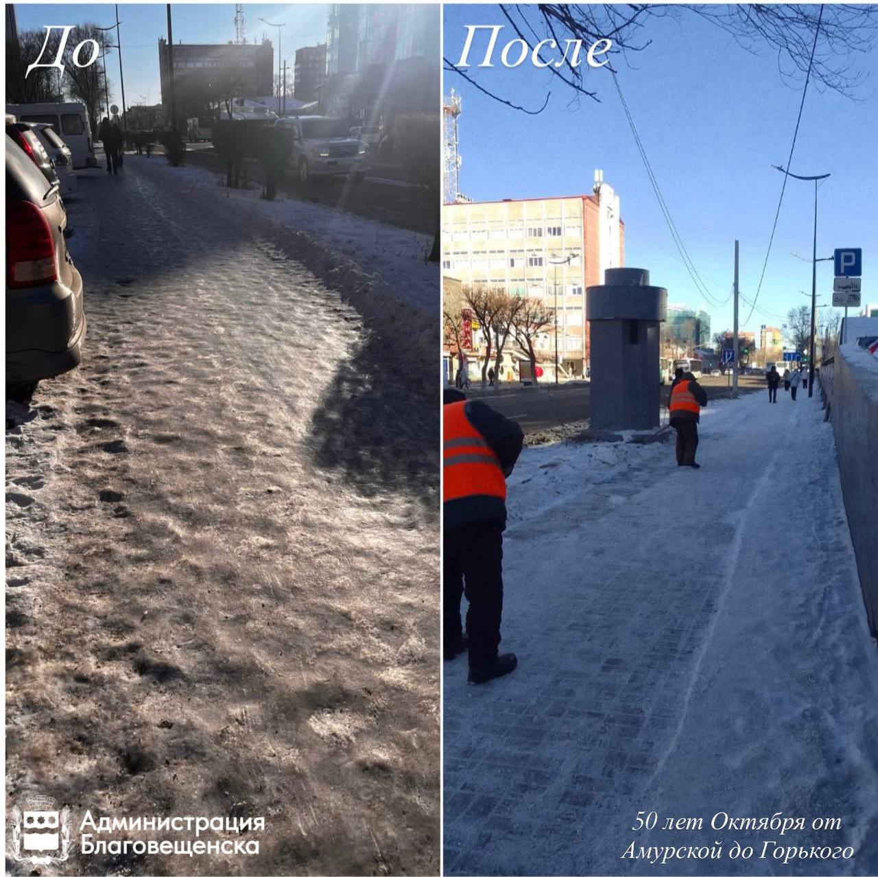 Поступали заявки и на уборку пешеходных зон на 50 лет Октября и Горького. Их рабочие почистили ручным методом — с помощью скалывателя льда и лопат.