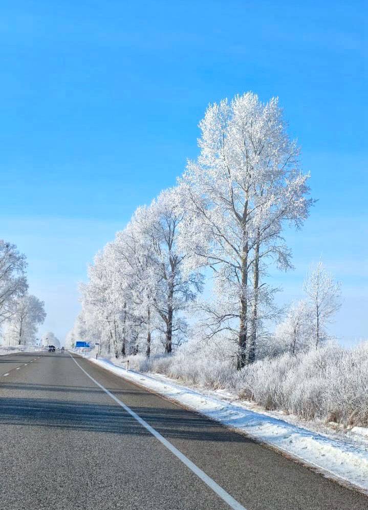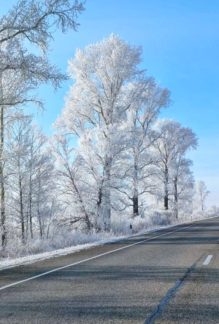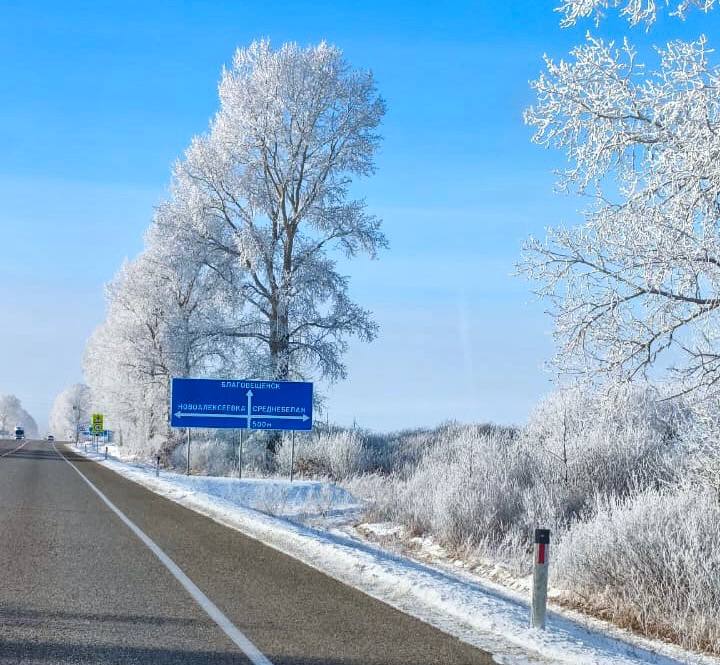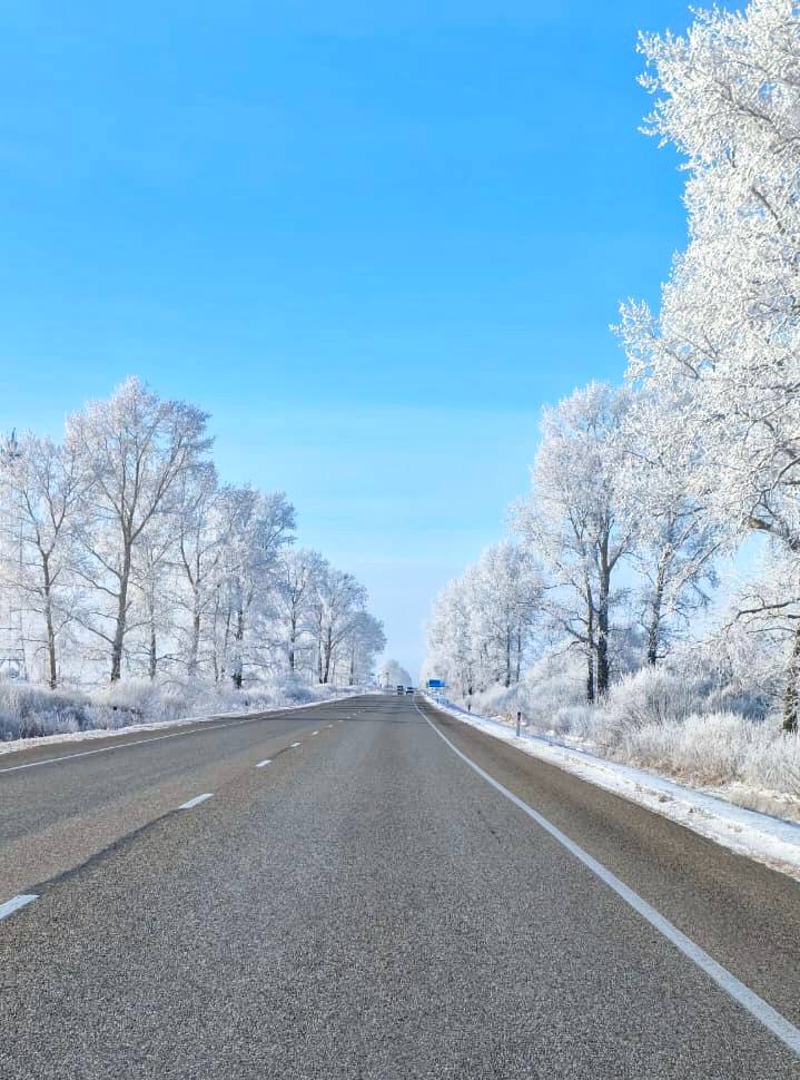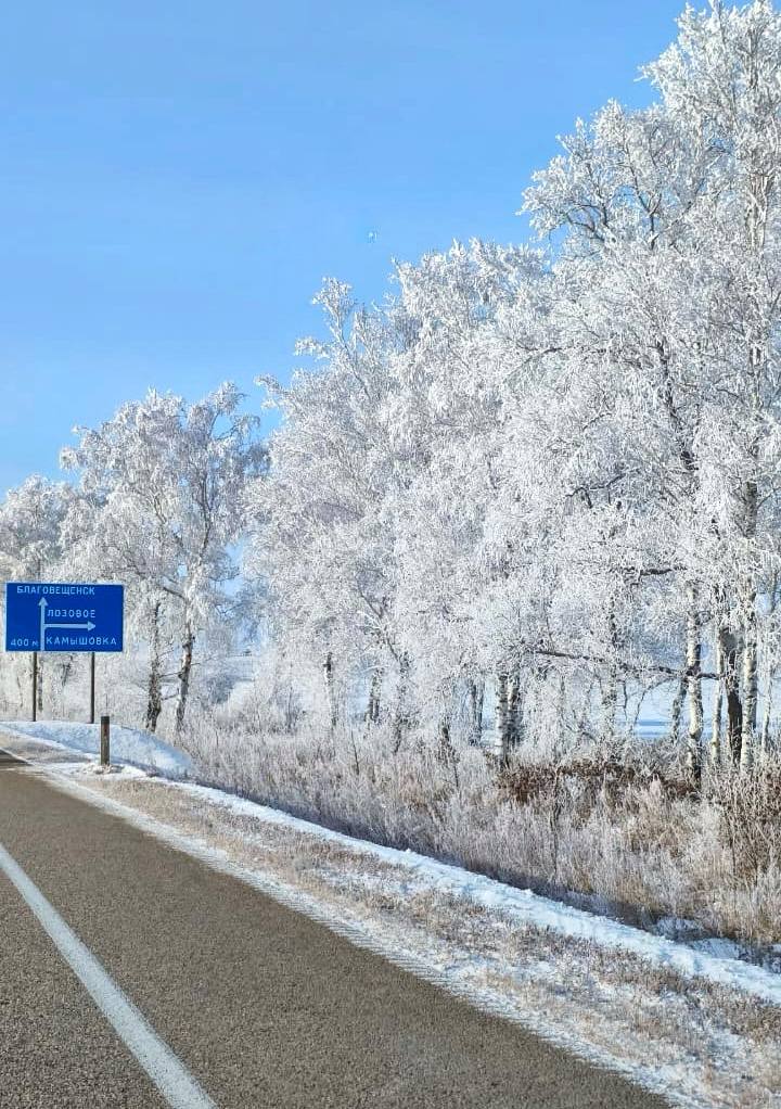 После прибытия ДедаМороза в Амурскую область деревья снова покрылись инеем, и теперь водители едут по региональным и федеральным трассам, как в сказке.