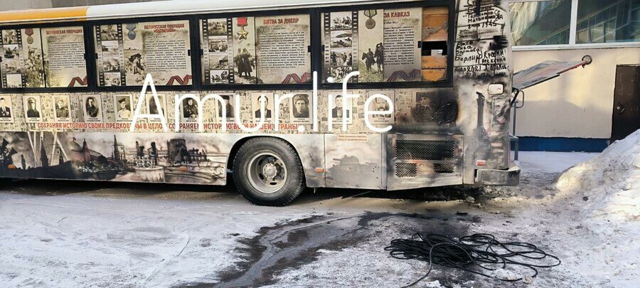 Днем, 26 ноября, в Благовещенске произошло возгорание в известном передвижном музее – автобус Победы. В этот момент он находился на территории старого корпуса школы №16, где для детей проводили экскурсию в автобус. На момент возгорания школьников внутри не было.