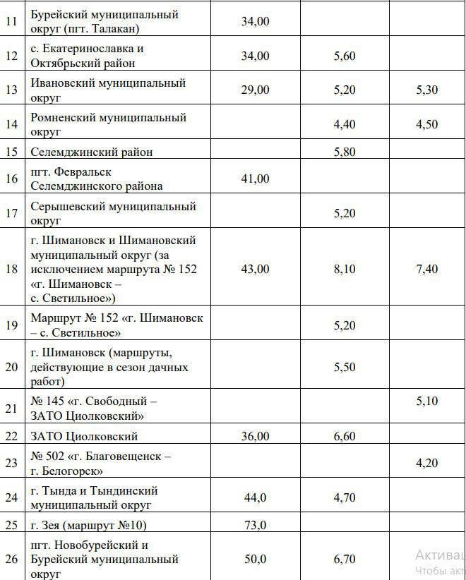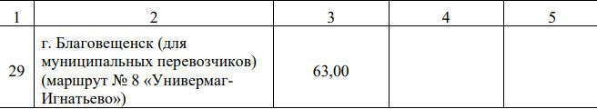 В приложении к приказу есть и тарифы, которые предлагается установить для муниципального перевозчика в Благовещенске. Так, проезд на автобусах (кроме маршрутов № 1 и № 8) для муниципальных перевозчиков не должен стоить больше 79 рублей. Маршрут № 1 Благовещенск – Мухинка – 103 рубля, а потолок цены на маршруте № 8 Универмаг – Игнатьево предлагается установить на отметке 63 рубля.