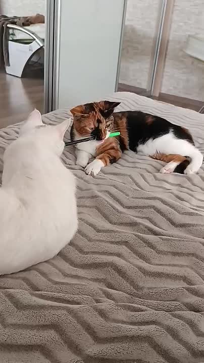 На протяжении 40 секунд питомица увлеченно грызла пишущий инструмент, выронив его всего раз. А вторая кошка, Лана, с интересом наблюдала за «подругой».