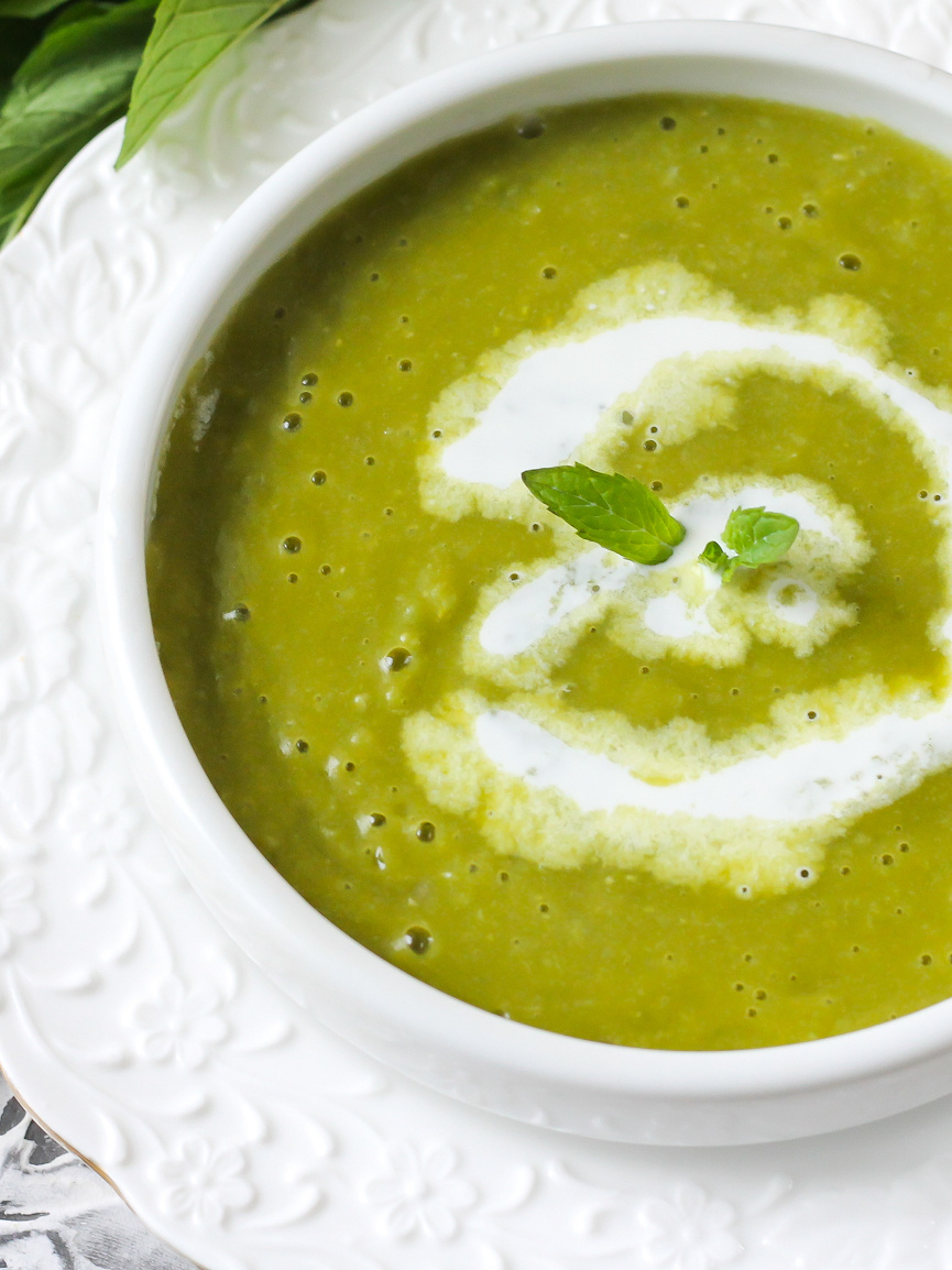Разлить суп по тарелкам, полить сливками и украсить свежими листьями мяты. Это блюдо отлично дополняется чесночными сухариками для добавления разнообразия вкуса или тертым сыром для любителей сытной пищи.