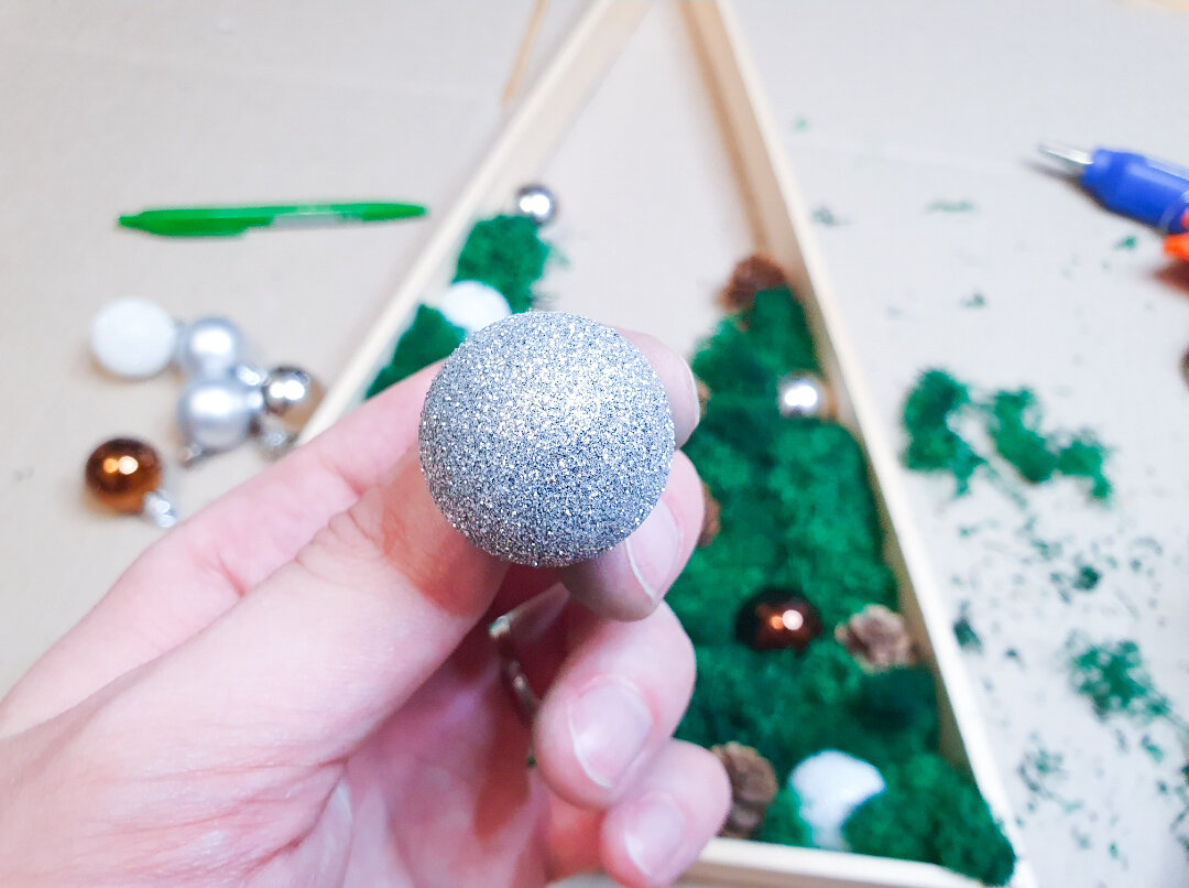 На данном этапе можно дать волю фантазии. Стабилизированный мох нарезаем на небольшие кусочки и приклеиваем к каркасу. Между кучками можно добавить игрушки или шишки для создания елочного декора. Эта часть может занять больше всего времени, но, безусловно, именно она придаст ёлке необычность.