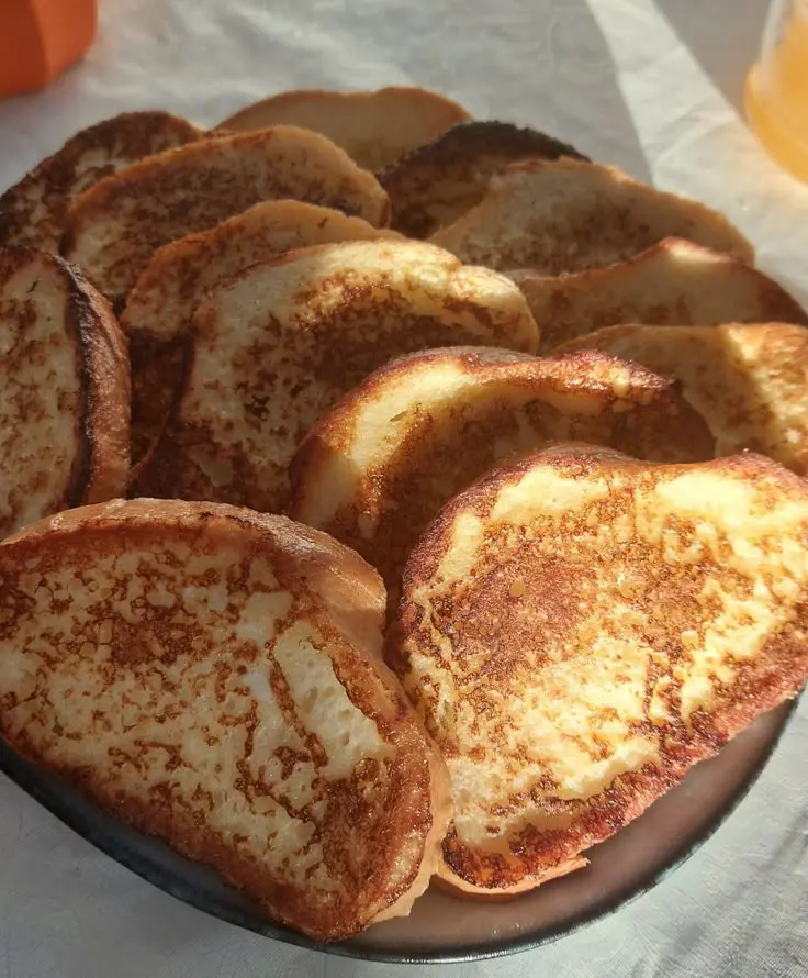 - Обжарка: Каждый ломтик хлеба погрузите в яично-молочную смесь, затем обжаривайте на растительном масле до золотистой корочки. По желанию, горячие гренки можно посыпать сахаром или сахарной пудрой.