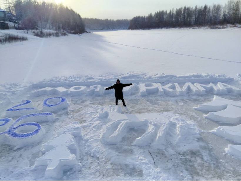 В лютый холод в одиночку работник местного Дома культуры Денис Павлов вышел на реку Нюкжа, чтобы нарисовать снежного коня — символ грядущего года — и поздравление односельчанам.