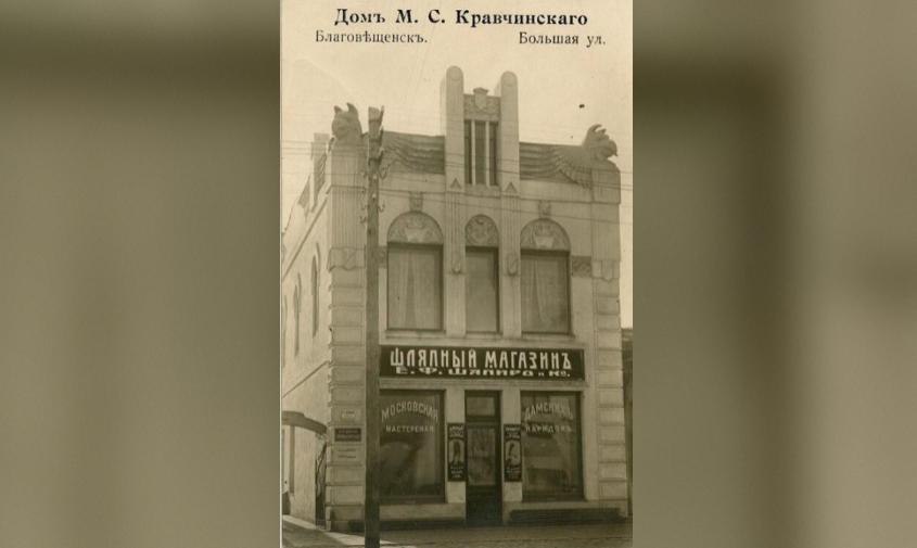 Амурский краевед Валентина Кобзарь в своем телеграм-канале показала фотографию двухэтажного дома в стиле модерн, принадлежавшего состоятельному благовещенцу М. С. Кравчинскому.
