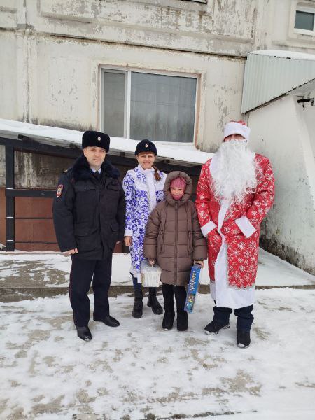 Долгожданные подарки девочке вручили лично руководитель отдела вместе с Полицейским Дедом Морозом и Снегурочкой.