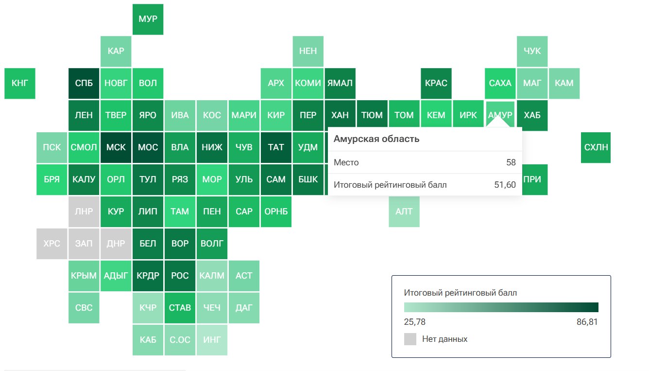 Амурская область заняла 58 строчку в рейтинге регионов РФ за 2025 год. Регион набрал 51,6 балла.