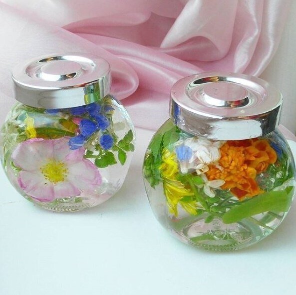 - Заливка глицерина: Глицерин смешивают с теплой водой в соотношении 1:2 (больше воды), заливая получившуюся смесь в подготовленные емкости до краев. Цветы аккуратно расправляют с помощью палочки и плотно закрывают крышкой, исключая пополнение воздуха.